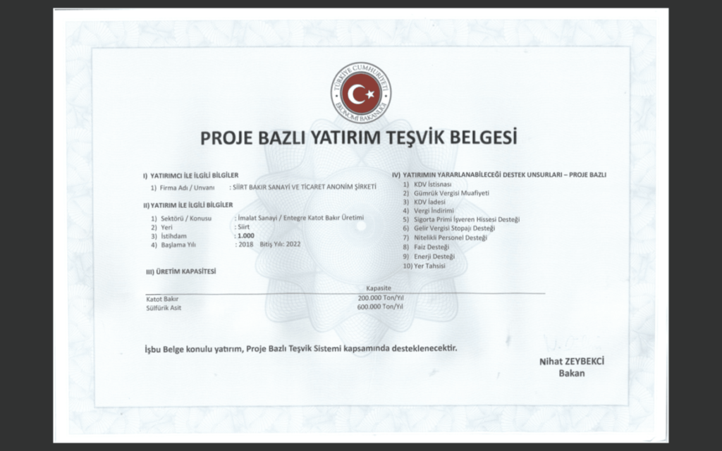 Project Based Investment Incentive Certificate" given to Linear Group by the Ministry of Economy of the Republic of Türkiye