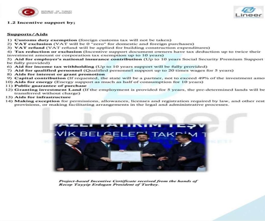 Project Based Investment Incentive Certificate" given to Linear Group by the Ministry of Economy of the Republic of Türkiye